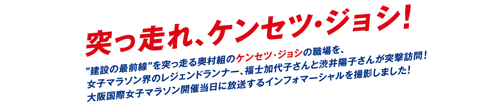 “建設の最前線”を突っ走る奥村組のケンセツ・ジョシの職場を、 女子マラソン界のレジェンドランナー・福士加代子さんと渋井陽子さんが突撃訪問! 大阪国際女子マラソン開催当日に放送するインフォマーシャルを撮影しました!
